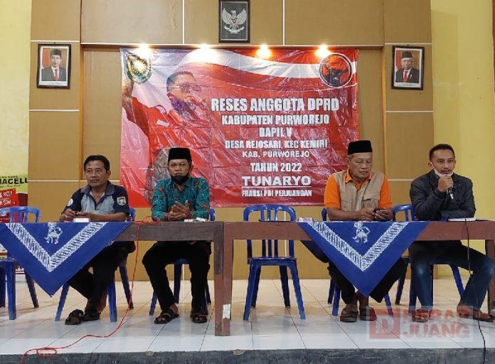 Kabupaten Purworejo – Ketua Fraksi PDI Perjuangan DPRD Purworejo yang juga menjabat sebagai Bendahara DPC Purworejo, Tunaryo menggelar Reses masa persidangan kedua tahun 2022. Reses kali ini digelar di Desa Rejosari dan Desa Bedono Kluwung, Kecamatan Kemiri, Minggu (29/5/2022).