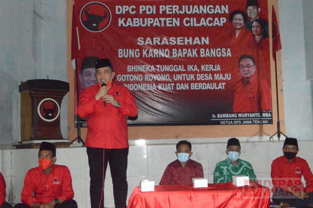 Kabupaten Cilacap – DPC PDI Perjuangan Kab. Cilacap menggelar sarasehan untuk memperingati Hari Lahir Bung Karno. Acara tersebut dilaksanakan dengan tetap menerapkan protokol kesehatan. Dalam acara yang dihadiri oleh 24 Ketua, Sekretaris dan Bendahara (KSB) PAC PDI Perjuangan se-Kab. Cilacap, Ketua Ranting PDI Perjuangan di wilayah Kota Cilacap, Komandate, Kepala Badan Kesatuan Bangsa dan Politik (Bakesbangpol) Kab. Cilacap, Drs. Sadmoko Danardono, M.Si, serta perwakilan dari PCNU Kab. Cilacap KH. Muslihun Azhari, dilaksanakan di Kantor DPC PDI Perjuangan Kab. Cilacap, Minggu (6/6/2021).