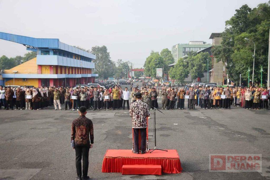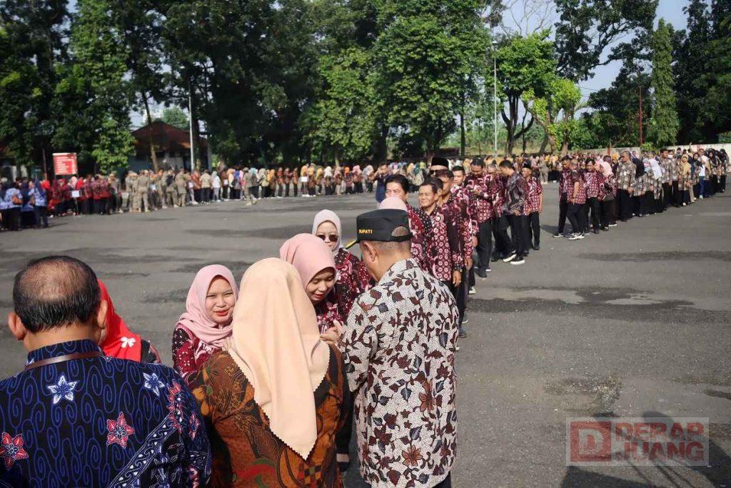 Kabupaten Banyumas – Bupati Banyumas, Drs. Sadewo Tri Lastiono, M.M. mengajak seluruh jajaran OPD untuk memperkuat silaturahmi dan kolaborasi sebagai penyambung komunikasi antar unit kerja untuk melayani masyarakat Banyumas dengan sabaik-baiknya. Hal tersebut disampaikan saat dirinya memimpin apel bersama di Halaman Sasana Krida Gor Satria Purwokerto yang diikuti seluruh OPD dan stakeholder di lingkungan Kab. Banyumas pada hari Jumat (11/04/2025).