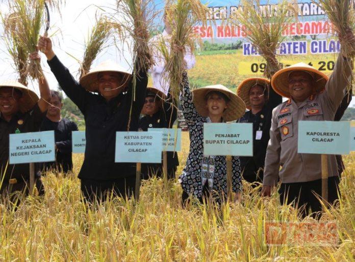 Kabupaten Cilacap – Panen Padi Nusantara 1 Juta Hektar, Ketua DPC PDI Perjuangan, sekaligus Ketua DPRD Kab. Cilacap, Taufik Nurhidayat, turut hadir dalam kegiatan tersebut bersama Penjabat (Pj) Bupati Cilacap Yunita Dyah Suminar, SKM, MSc, M.Si, jajaran Forkopimda, Camat Kesugihan, Cardian Wicaksono, S.STP, Kepala Desa Kalisabuk, Perwakilan Ditjen Hortikultura, Kepala Bulog Divisi Regional Banyumas, BBPTUHPT Baturraden, di area persawahan Jl. Protokol, Desa Kalisabuk, Kecamatan Kesugihan, Kamis (9/3/2023).
