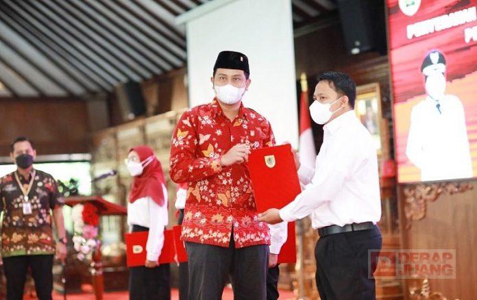 Kabupaten Klaten – Ketua DPRD Klaten, Hamenang Wajar Ismoyo, S.I.Kom menyerahan Surat Keputusan (SK) pengangkatan CPNS Pemkab Klaten formasi tahun 2021 yang diselenggarakan di Pendopo Pemerintah Kabupaten Klaten, Selasa (31/5/2022).