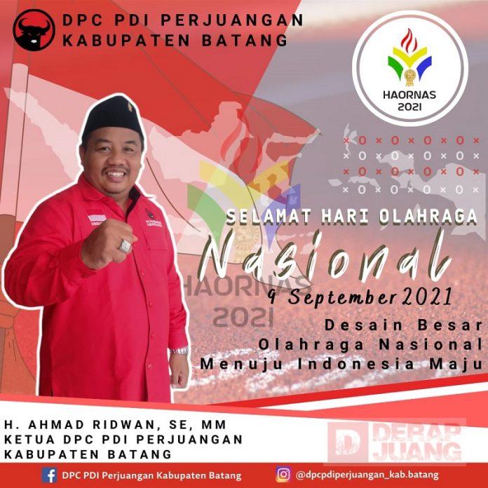 Kabupaten Batang – Di momen Hari Olahraga Nasional (Haornas), Ketua DPC PDI Perjuangan Kabupaten Batang, H. Ahmad Ridwan mengajak kader Partai dan masyarakat Batang untuk rajin berolahraga. Menurutnya, berolahraga merupakan salah satu cara menambah imun tubuh agar terhindar dari serangan virus Covid-19, Kamis (9/9/2021).