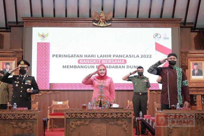 Kabupaten Klaten – Bupati Klaten, Hj. Sri Mulyani, S.M bersama jajaran Pemkab Klaten serta OPD se-Kabupaten Klaten mengikuti Upacara Peringatan Hari Lahir Pancasila yang digelar secara nasional melalui siaran daring dari Pendopo Pemerintah Daerah Klaten. Pada upacara ini, peserta mengenakan pakaian lurik sebagai identitas Klaten, Rabu (1/6/2022).