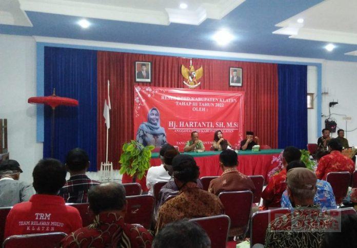 Kabupaten Klaten – Anggota Fraksi PDI Perjuangan DPRD, Klaten Hj. Hartanti, S.H., M.Si bergerak turun ke daerah pemilihannya untuk melakukan silahturahmi dan dialog guna menampung aspirasi masyarakat melalui reses yang nantinya akan dijadikan pokok pikiran anggota DPRD dan disampaikan ke pemerintah daerah.
