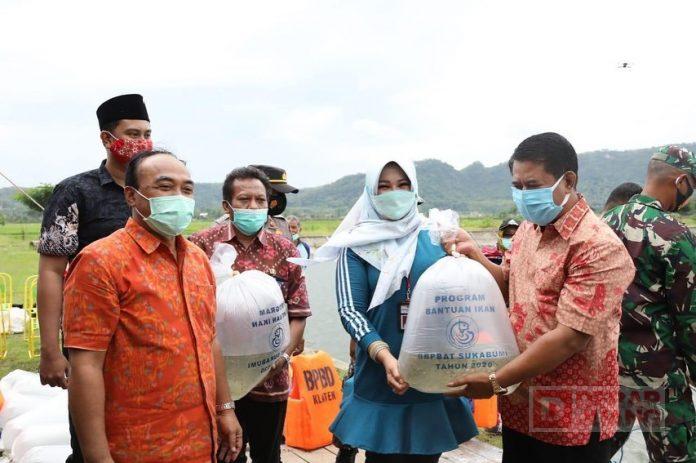 Kabupaten Klaten – Bupati Klaten, Hj. Sri Mulyani, bersama Anggota Fraksi PDI Perjuangan DPR RI, H. Sunarno, S.E. M.Hum , Ketua DPRD Kab. Klaten, Hamenang Wajar Ismoyo S.I.Kom, serta Kementerian Kelautan dan Perikanan (KKP) Republik Indonesia melalui Direktur Jendral Perikanan Budidaya, menebarkan 500 ribu benih ikan air tawar diembung Karangasem Kecamatan Cawas. Rencananya benih ikan tersebut juga akan ditebar di 5 embung yang berada di Wilayah Kab. Klaten, Jumat, (22/1/2021).