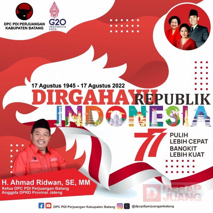 Kabupaten Batang – Dalam rangka memperingati HUT RI ke 77, H. Ahmad Ridwan yang merupakan Ketua DPC PDI Perjuangan Batang berpesan kepada seluruh kader PDI Perjuangan khususnya di Kabupaten Batang agar menjunjung tinggi semangat dan rasa nasionalisme pada Rabu, (17/08/2022)