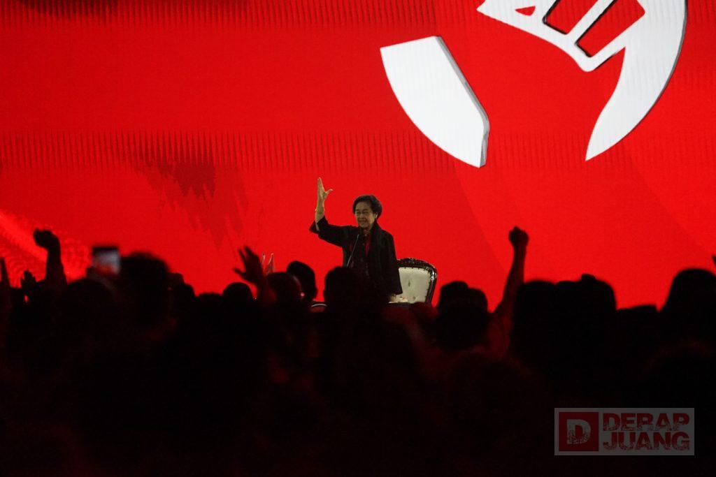 DKI Jakarta – Ketua Umum PDI Perjuangan, Ibu Megawati Soekarnoputri menyampaikan pidato politik penuh makna dan apresiasi dalam Rakernas PDIP ke-V. Salah satunya adalah ucapan terima kasihnya kepada seluruh masyarakat Indonesia atas dukungan yang telah diberikan kepada PDI Perjuangan, sehingga partai PDI Perjuangan berhasil memenangkan Pemilu legislatif tiga kali berturut-turut.