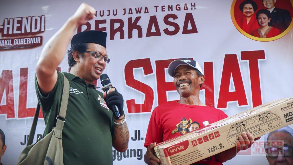 Dari pantauan Tim Derap Juang, ratusan peserta Nampak hadir berbondong-bondong memadati lokasi acara. Sebagian besar dari mereka juga membawa Alat Peraga Kampanye (APK) seperti roundtext, topeng, hingga spanduk Andika-Hendi.