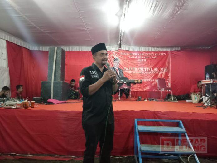 Kabupaten Klaten – Anggota Fraksi PDI Perjuangan DPRD Kab. Klaten, Eko Prasetyo, S.E., M.Si., mengelar Reses Tahap III Tahun 2021, dalam rangka menyerap aspirasi warga di Daerah Pemilihan (Dapil) II Kecamatan Jogonalan. Kali ini, pihaknya melaksanakan kegiatan Reses di Desa Bakung, Desa Gondangan Kecamatan Jogonalan.