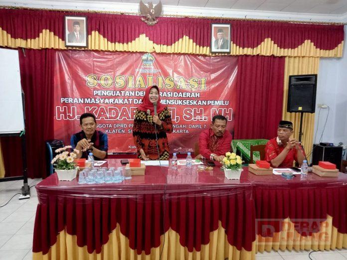 Kabupaten Klaten – Anggota Fraksi PDI Perjuangan DPRD Jawa Tengah, Hj. Kadarwati, S.H., M.H menggelar Sosialisasi Penguatan Demokrasi Daerah di Kecamatan Delanggu, Sabtu (21/1/2023).