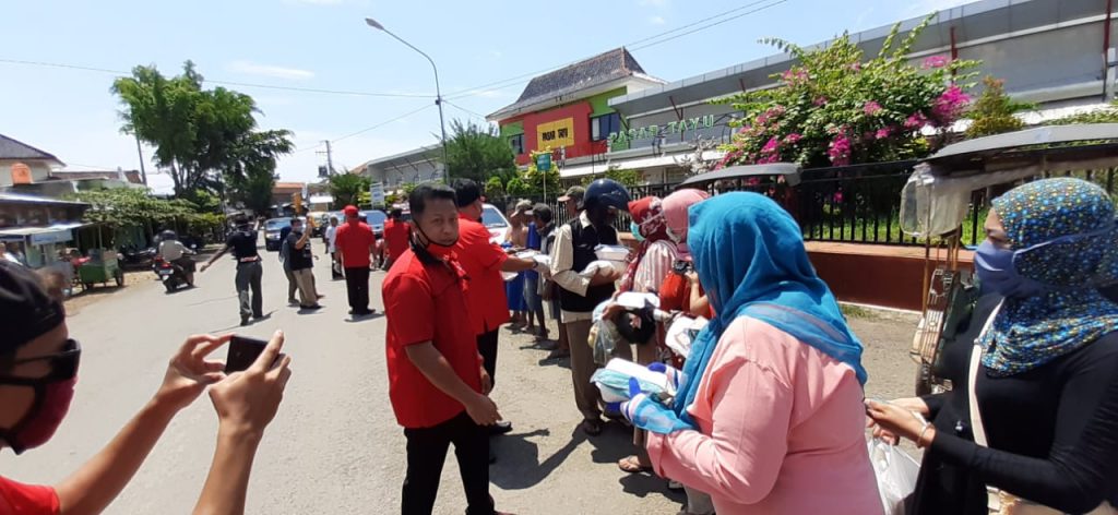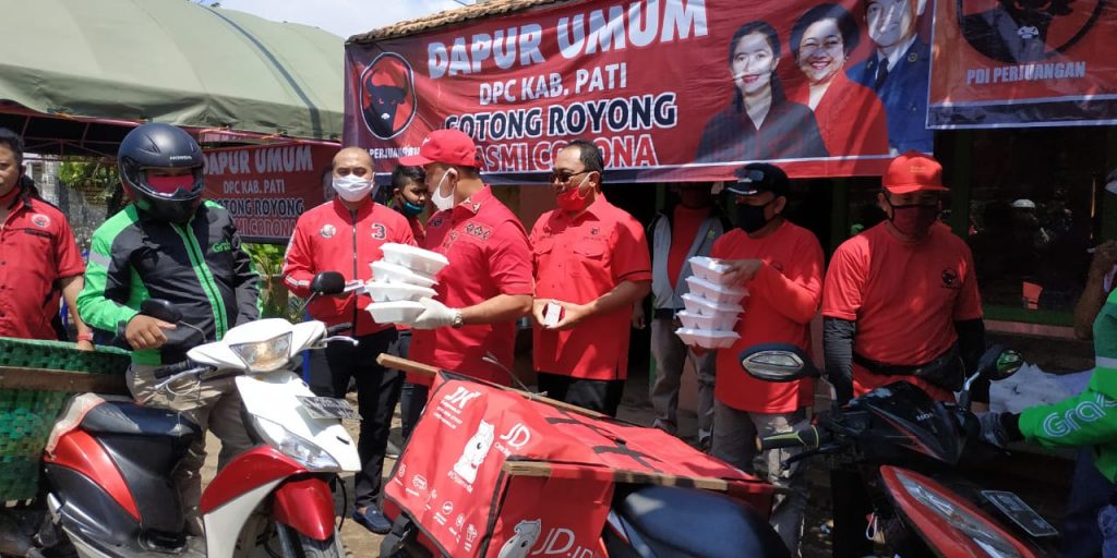Kabupten Pati – Gotong royong untuk meringankan beban masyarakat kurang mampu yang terdampak pandemi Covid-19 dan melaksanakan Instruksi DPP Partai No. 1375 serta himbauan dari Ketua Umum PDI Perjuangan, Ibu Megawati Sukarnoputri, DPC PDI Perjuangan Kabupaten Pati bersama dengan Anggota DPRD Prov. Jawa Tengah, Komunitas Juang, PAC Kec. Tayu, para relawan dan kader Partai membuat dapur umum dan melaksanakan bakti sosial pada hari Senin, 14 April 2020, di wilayah Kecamatan Tayu, Pati.