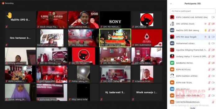 Kabupaten Batang – Badan Saksi Pemilu Nasional (BSPN) Cabang Kab. Batang mengikuti seminar yang mengusung tema “Peranan Pemuda dan Perkembangan Kebudayaan di Masa Pandemi Covid-19. Kegiatan yang diselenggarakan oleh DPD PDI Perjuangan Jawa Tengah, untuk memperingati HUT PDI Perjuangan ke-48, diikuti oleh DPC PDI Perjuangan Kab. Batang secara virtual, Sabtu, (27/2/2021).