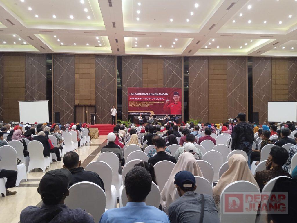 Kabupaten Banyumas – Komandan Tempur Elektoral Bintang Empat pengampu Banyumas-Cilacap, Adisatrya Suryo Sulisto menggelar tasyakuran kemenangan dengan terpilih kembali sebagai Anggota DPR RI Dapil VIII Jawa Tengah bersama tim sukses dan relawan yang dilaksanakan di Jade Room lantai dua Hotel Grand Karlita Purwokerto pada Sabtu (09/03/2024).