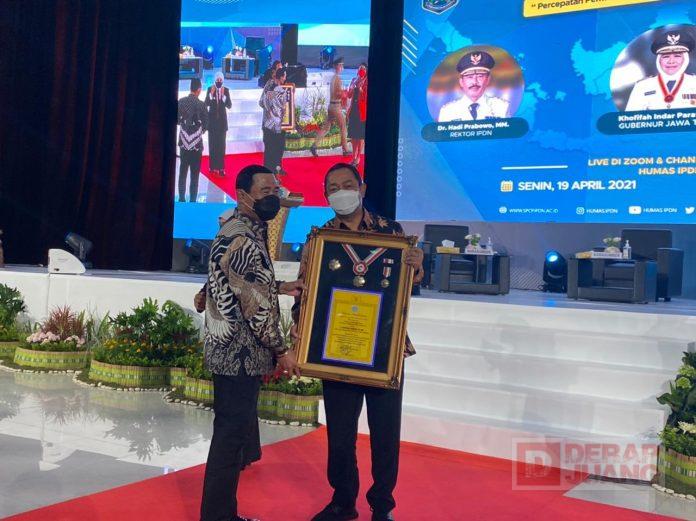 Kota Semarang – Wali Kota Semarang Hendrar Prihadi menerima piagam penghargaan tanda kehormatan Kartika Pamong Praja Muda dari Institut Pemerintahan Daerah (IPDN). Ini menjadi kedua kalinya Wali Kota Semarang yang akrab disapa Hendi itu mendapatkan apresiasi dari IPDN. Sebelumnya, sekitar tahun 2011, Hendi juga pernah mendapatkan tanda anggota kehormatan.