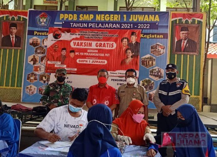 Kabupaten Pati – Sekretaris DPC PDI Perjuangan Kab. Pati, Sutarto Oenthersa bekerja sama dengan Puskesmas Juwana melaksanakan vaksinasi tahap pertama untuk usia 12 tahun ke atas di Kec. Juwana, Rabu (03/11/2021).