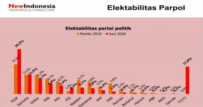 “Elektabilitas PDI Perjuangan masih tertinggi dan meningkat hingga 29,3%, membuktikan bahwa PDI Perjuangan masih kokoh,” ungkap Andreas Nuryono selaku Direktur Eksekutif New Indonesia Research & Consulting.