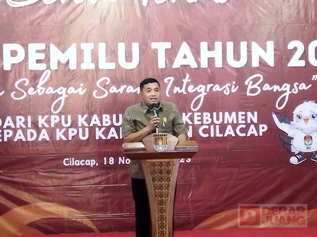 Foto: Taufik Nurhidayat membnerikan sambutan pada acara Kirab Pemilu Damai 2024 yang diselenggarakan oleh KPU Cilacap