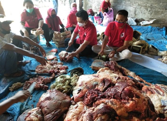 Kabupaten Pati – Komunitas Juang Pati secara serempak dan gotong-royong ikut serta dalam perayaan Idul Adha tahun ini dengan melakukan penyembelihan hewan kurban yang dimiliki oleh DPC PDI Perjuangan Pati, Sabtu (1/8/2020).