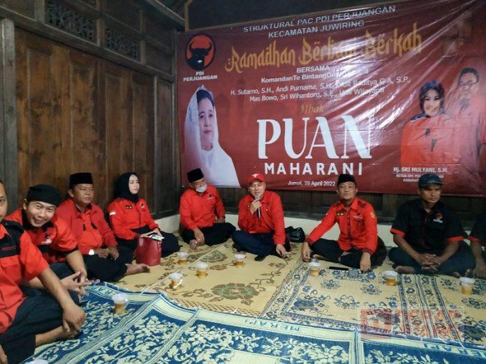 Arif selaku Sekretaris PAC Juwiring mengatakan bahwa kegiatan ini untuk merapatkan barisan dan menjaga silaturahmi sesama kader Partai. Selain itu juga ditujukan untuk membagikan beras premium bantuan dari Ketua DPR RI, DR (H.C.) Puan Maharani.