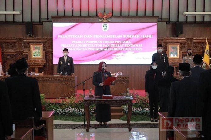Kabupaten Klaten – Bupati Klaten, Hj. Sri Mulyani, S.M., resmi melantik dan memimpin pengambilan sumpah/janji pejabat pimpinan tinggi pratama, pejabat administrator, dan pejabat pengawas di lingkungan Pemerintah Kabupaten Klaten.