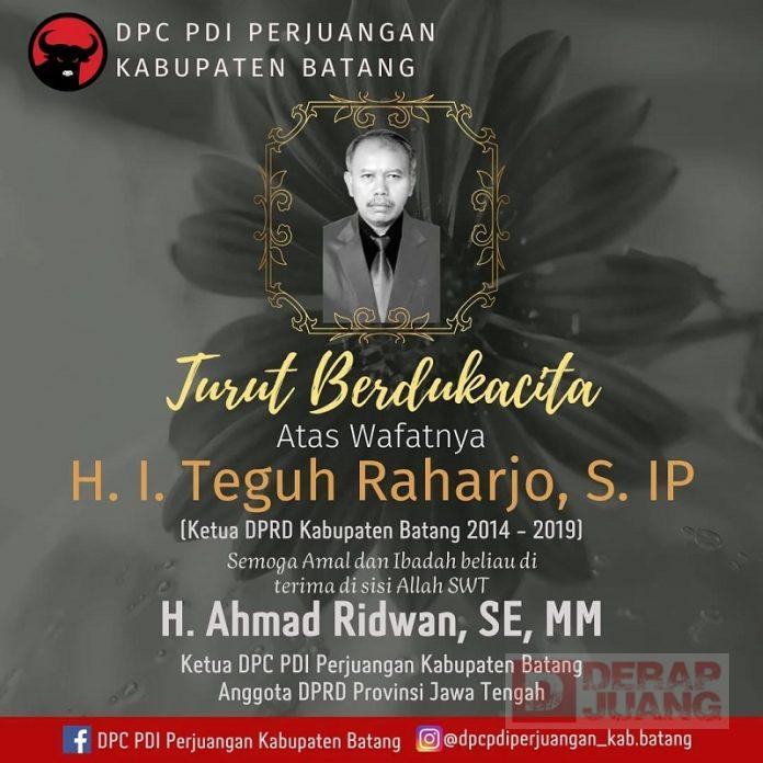 Kabupaten Batang – Mantan Ketua DPRD Kabupaten Batang periode 2014-2019, H. Imam Teguh Raharjo meninggal dunia. Atas kabar duka tersebut, keluarga besar PDI Perjuangan Batang menyampaikan belasungkawa mendalam, Minggu (5/9/2021).