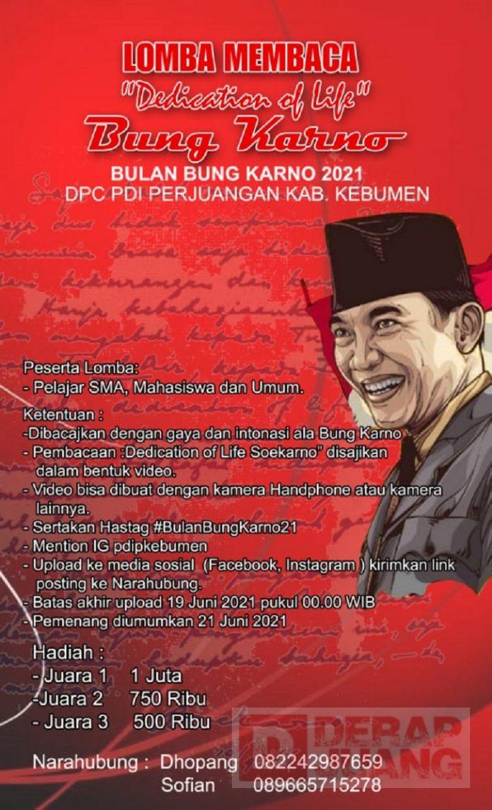 Kabupaten Kebumen – Dalam rangka menyemarakkan Bulan Bung Karno, DPC PDI Perjuangan Kebumen menggelar perlombaan membaca Dedication of Life Bung Karno, dengan peserta Pelajar (SMA), Mahasiswa, dan masyarakat umum.