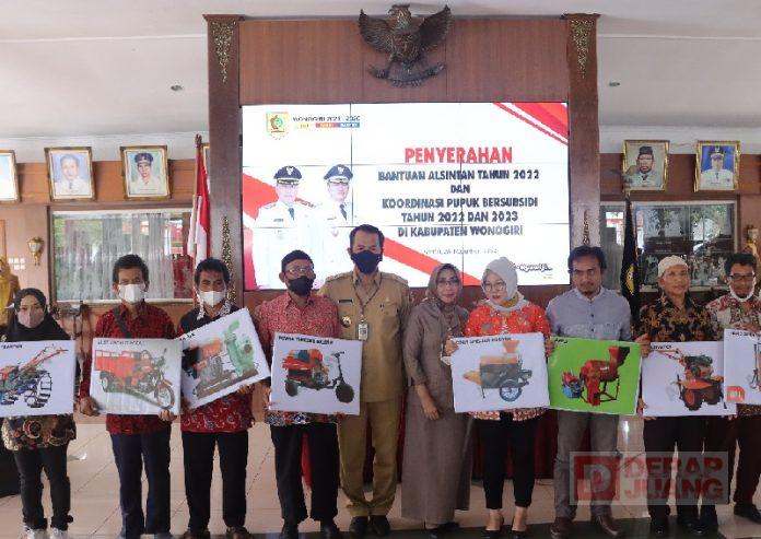 Kabupate Wonogiri – Sejumlah petani di Wonogiri menerima bantuan 127 unit alat dan mesin pertanian (Alsintan). Penyerahan bantuan Alsintan tersebut dilakukan di pendopo Kabupaten Wonogiri oleh Bupati Wonogiri, Joko Sutopo atau yang akrab disapa Mas Jekek, Senin (28/11/2022).