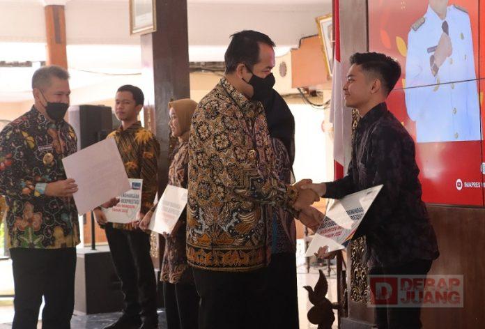 Kabupaten Wonogiri – Bupati Wonogiri, Joko Sutopo atau yang akrab disapa Mas Jekek menyerahkan secara simbolis beasiswa bagi mahasiswa berprestasi. Adapun acara ceremonial pemberian beasiswa berlangsung di Pendopo Rumah Dinas Bupati Wonogiri, Kamis (29/12/2022).