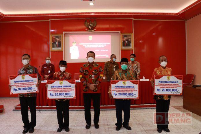 Kabupaten Wonogiri – Bertempat di ruang Khayangan kompleks Setda Kabupaten Wonogiri, Bupati Wonogiri Joko Sutopo serahkan tunjangan Kompensasi bagi 19 Sekretaris Desa (Sekdes) yang sesuai regulasi telah berakhir masa jabatannya akan tetapi tidak dapat diangkat menjadi Pegawai Negeri Sipil.