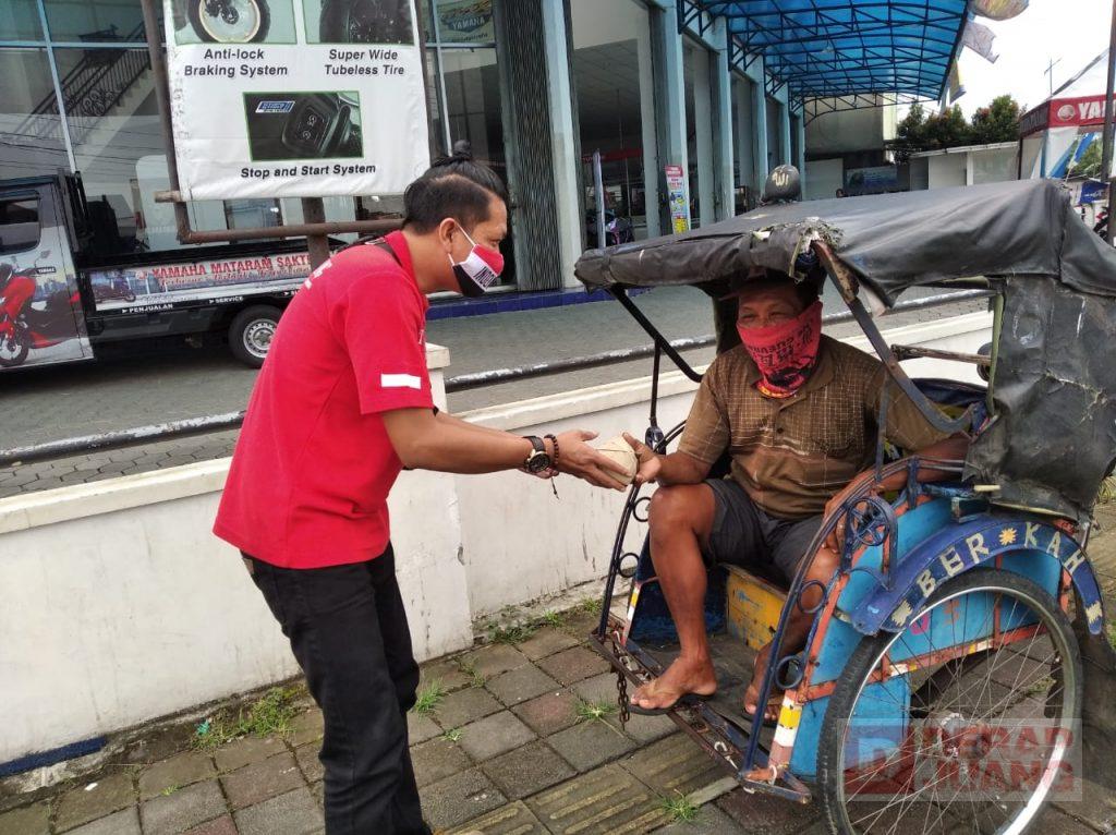 Kader KOmunitas Juang Banyumas sedang membagikan nasi bungkus kepada pengayuh becak yang ada di Kab. Banyumas
