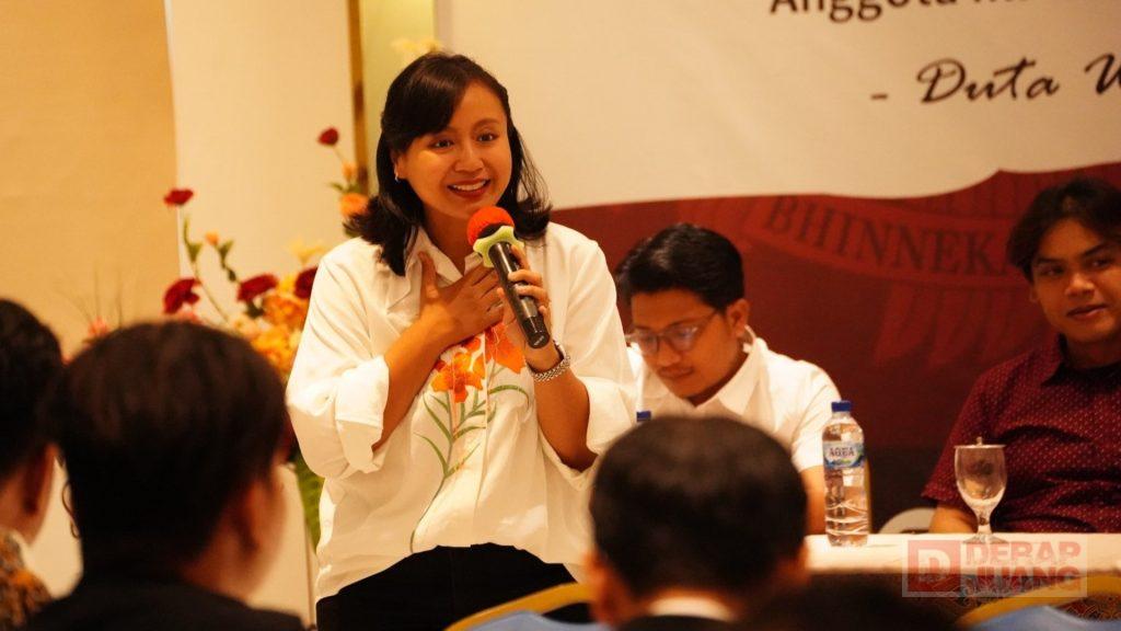 Foto: Mbak casytha (Berdiri) Mengajak Generasi Muda untuk Aktif dalam Berorganisasi Sekaligus Menjaga Kepercayaan dan Solidaritas