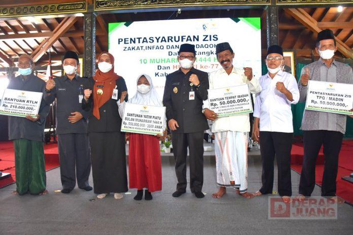 Kabupaten Demak – Memperingati 10 Muharram, sekaligus HUT ke-77 Kemerdekaan Republik Indonesia, melalui rekan-rekan Baznas Kab. Demak, Bupati yang juga Politisi PDI Perjuangan Demak, dr. Hj. Eisti’anah ini melaksanakan Pentasyarufan Zakat, Infaq, dan Shodaqoh, Rabu (10/08/2022).