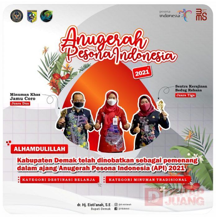 Politisi PDI Perjuangan itu menambahkan, bahwa Kab. Demak masuk pada kedua kategori berikut, yakni Kategori Minuman Tradisional; Minuman Khas Jamu Coro dan Kategori Destinasi Belanja; Sentra Kerajinan Bedug Rebana.