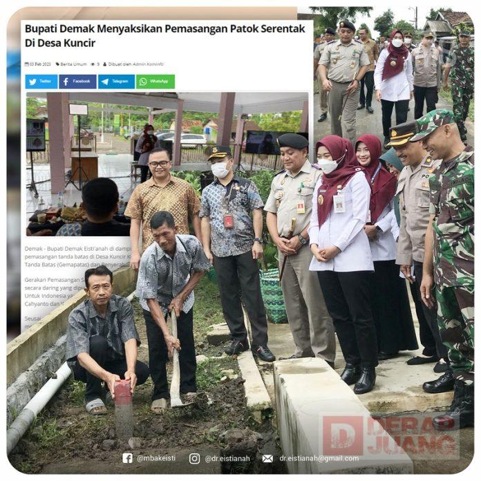 Kabupaten Demak – Bersama perwakilan Forkopimda dan Forkopimcam Wonosalam, Bupati Demak dr. Hj. Eisti’anah menyaksikan pemasangan tanda batas (patok wilayah) yang ada di Desa Kuncir, Kec. Wonosalam dan acara daring Gemapatas serta Penyerahan Sertifikat Aset Pemerintah Daerah.