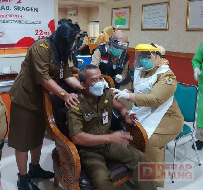 Kabupaten Sragen – Pemerintah Kabupaten Sragen mulai mencanangkan vaksinasi tahap kedua yang diawali oleh jajaran Aparatur Sipil Negara (ASN) di lingkungan Pemkab Sragen. Dalam kesempatan tersebut terdapat pemandangan menarik, di mana Bupati Sragen, dr. Hj Kusdinar Untung Yuni Sukowati turut menjadi vaksinator bagi sejumlah jajaran pejabat di lingkup Pemkab Sragen.