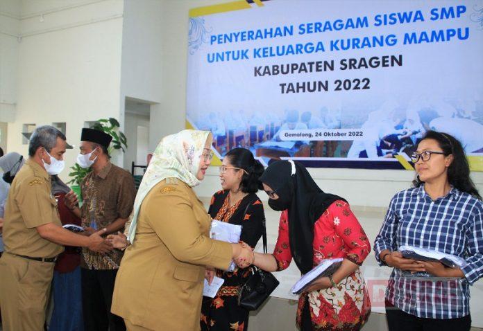 Kabupaten Sragen – Bupati Sragen, Kusdinar Untung Yuni Sukowati atau yang akrab disapa Mbak Yuni membagikan seragam sekolah putih biru sebanyak 8.977 buah kepada murid SMP kurang mampu. Adapun kegiatan tersebut diinisiasi oleh Dinas Pendidikan Sragen untuk membantu orang tua siswa yang mengalami kendala finansial untuk membelikan seragam untuk anaknya, Selasa (25/10/2022).