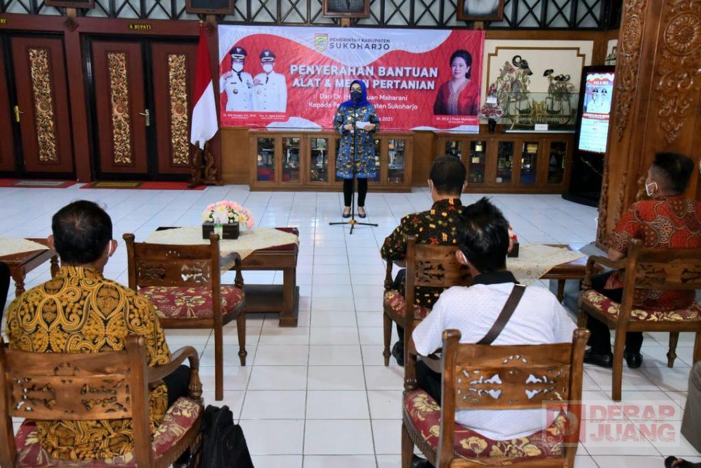 Kabupaten Sukoharjo – Bupati Sukoharjo, Hj. Etik Suryani, S.E., M.M., secara simbolis menyerahkan bantuan Alat Mesin Pertanian (Alsintan) kepada petani. Alsintan tersebut merupakan bantuan dari Ketua DPR RI, Puan Maharani, dimana Kab. Sukoharjo mendapatkan 42 Alsintan. Bantuan tersebut kemudian didistribusikan pada kelompok tani (klomtan), Jumat (27/8/2021).