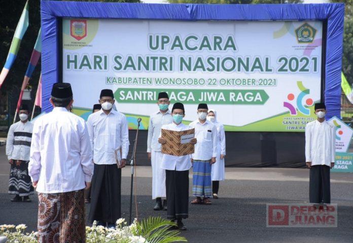 Kabupaten Wonosobo – Presiden Joko Widodo melalui Keputusan Presiden Nomor 22 Tahun 2015, telah menetapkan tanggal 22 Oktober sebagai Hari Santri yang diperingati secara nasional. Karena masih dalam situasi Pandemi Covid-19, Pemkab Wonosobo menggelar peringatan dengan kegiatan yang terbatas dan sederhana serta tetap memperhatikan protokol kesehatan. Pada puncak peringatan Hari Santri tahun ini, digelar Upacara Bendera di halaman Pendopo Bupati. Jumat, (22/10/2021).