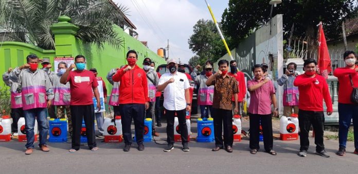 Kabupaten Karanganyar – Dengan semangat tak henti-hentinya DPC PDI Perjuangan melakukan penyemprotan disinfektan, serta pembagian masker dan sembako di Kecamatan Mojogedang. Kegiatan ini dihadiri oleh Wakil Bupati, Anggota DPRD kabupaten Karanganyar, dan melibatkan seluruh kader Banteng moncong putih dengan mengundang RT, Kepala desa serta tokoh masyarakat, Senin (27/4/2020). Kegiatan ini merupakan bentuk kepedulian PDI Perjuangan Karanganyar dalam rangka membantu masyarakat dalam menghadapi pandemi Covid-19.