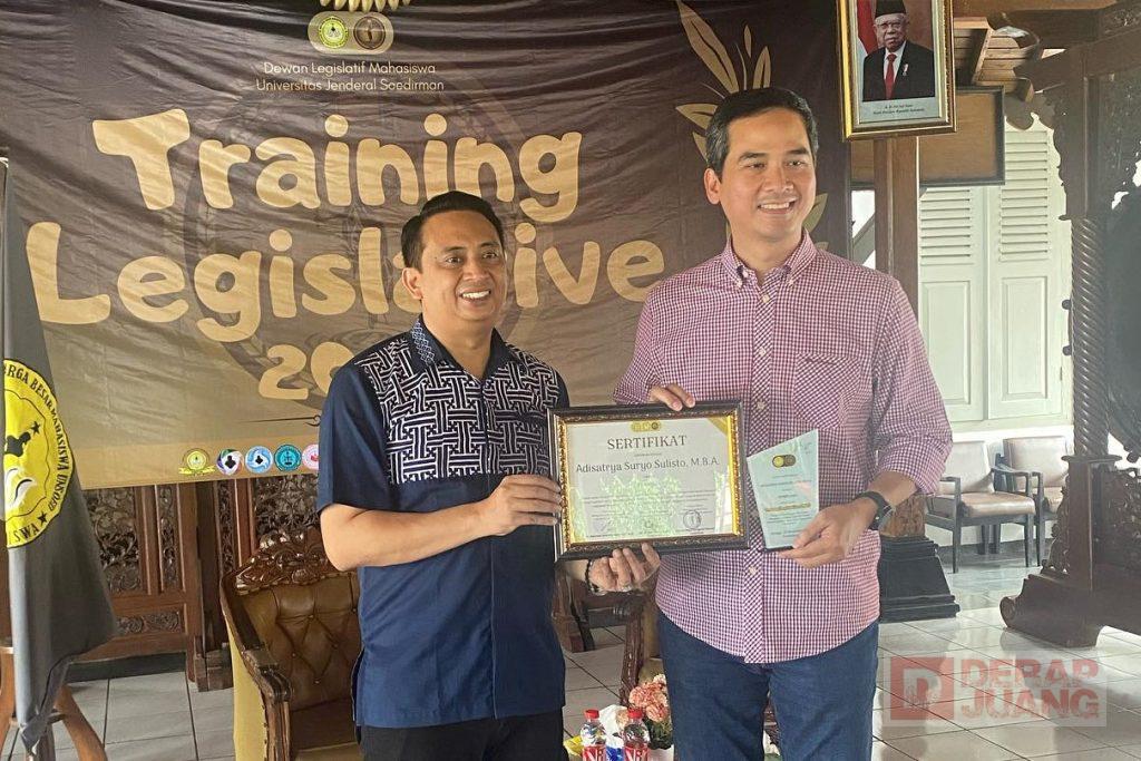 Kabupaten Banyumas – Anggota DPR RI, Adisatrya Suryo Sulisto menghadiri undangan Dewan Legislatif Mahasiswa (DLM) Fakultas Hukum Universitas Jenderal Soedirman (Unsoed) pada acara Training Legislative 2023 yang diikuti oleh perwakilan mahasiswa se-Kabupaten Banyumas yang dilaksanakan di Pendhopo Wakil Bupati Banyumas pada Minggu (26/11/2023).