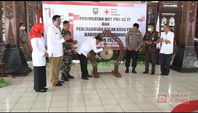 Kabupaten Semarang – PMI Kab. Semarang kembali menggalang dana dari masyarakat untuk biaya operasional kegiatan rutin. Bulan dana PMI tahun 2022 ini digelar selama tiga bulan sampai akhir Desember nanti. Pencanangan bulan Dana PMI, digelar di Pendopo Rumah Dinas Bupati Semarang, Senin (3/10/2022).