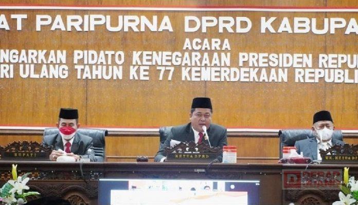 Selasa (16/08/2022), rapat yang turut dihadiri oleh jajaran Forkopimda, jajaran OPD serta para Camat secara virtual ini merupakan serangkaian kegiatan dalam peringatan HUT ke-77 RI. Menurut Ketua DPRD, Ali Badrudin bahwa dalam pidato kenegaraan Presiden Republik Indonesia Ir. Joko Widodo yang diikuti secara virtual tersebut.