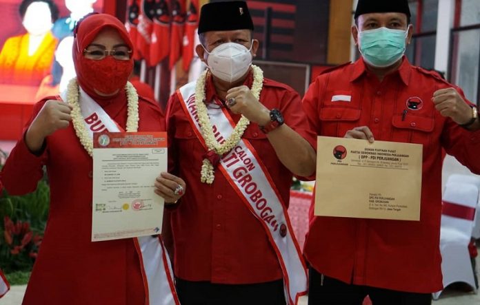 Kabupaten Grobogan – Ketua DPC PDI Perjuangan sekaligus Calon Bupati Kab. Grobogan Hj. Sri Sumarni bersama wakilnya dr. H. Bambang Pujiyanto mengambil Formulir Model B.1-KWK Parpol jelang Pilkada Serentak tahun 2020, Rabu (2/9/2020).