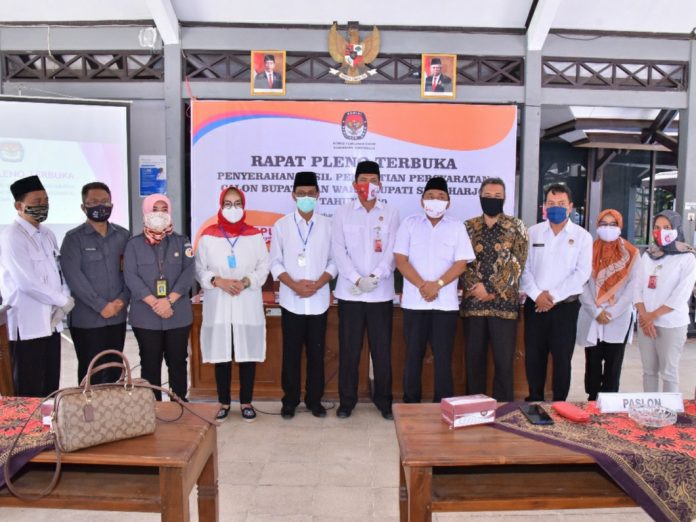 Kabupaten Sukoharjo – Komisi Pemilihan Umum (KPU) Kab. Sukoharjo menggelar Rapat Pleno terbuka penyerahan hasil penelitian persyaratan Calon Bupati dan Wakil Bupati Sukoharjo tahun 2020, Senin (14/9/2020).