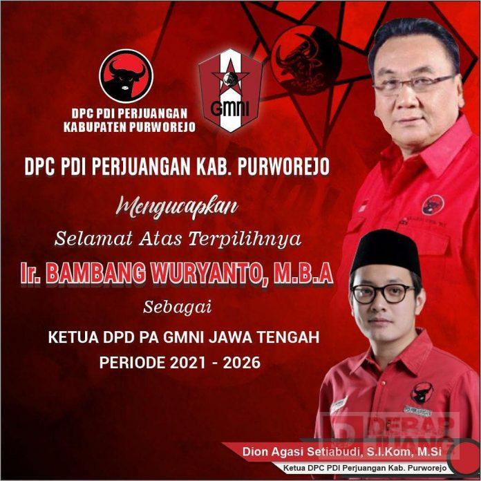 Hal tersebut juga disampaikan melalui unggahan Instagram @pdip.purworejo dengan caption, DPC PDI Perjuangan Kab Purworejo mengucapkan selamat atas terpilihnya Ir. Bambang Wuryanto, M.B.A sebagai Ketua PA GMNI Provinsi Jawa Tengah Periode 2021-2026. Selamat Komandan!!!