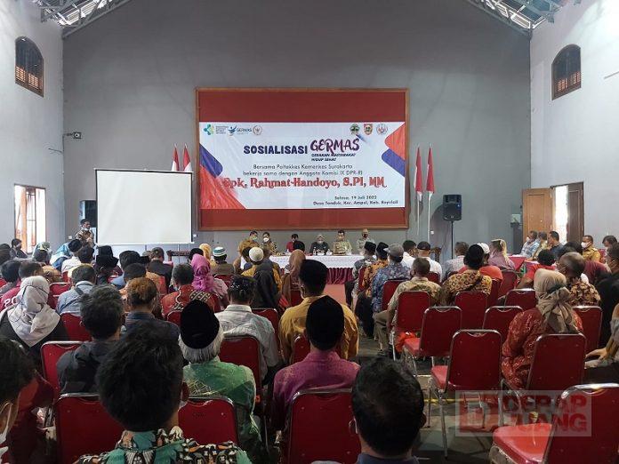 Kabupaten Boyolali – Anggota Fraksi PDI Perjuangan DPR RI, Rahmad Handoyo, S.Pi., M.M menggelar giat Sosialisasi Gerakan Masyarakat Hidup Sehat (GERMAS) bersama Poltekkes Kemenkes Surakarta di Kantor Desa Tanduk Kecamatan Ampel, Selasa (19/7/2022).