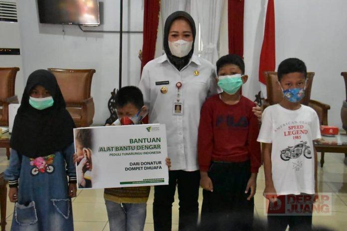 Kabupaten Purbalingga – Lembaga filantropi Dompet Dhuafa memberikan alat bantu dengar kepada tiga penyandang tunarungu di Ruang Pringgitan Pendopo Dipokusumo, Rabu (3/3/2021). Penyerahan bantuan tersebut dilakukan oleh Bupati Purbalingga, Dyah Hayuning Pratiwi.