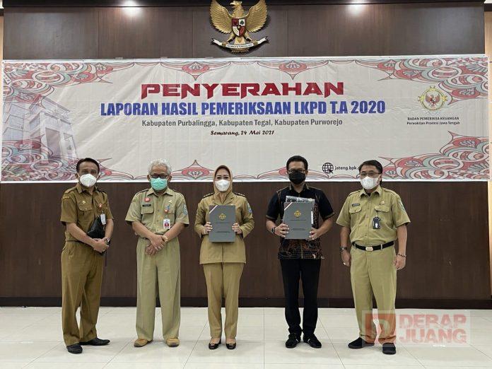 Kota Semarang – Pemerintah Kab. Purbalingga meraih predikat Wajar Tanpa Pengecualian (WTP) untuk Laporan Keuangan Daerah (LKD) Tahun 2020. Prestasi tersebut diraih untuk kelima kali berturut-turut sejak Tahun 2016. Bupati Purbalingga, Dyah Hayuning Pratiwi bersyukur, sebab Pemerintah Kab. Purbalingga kembali mendapatkan opini Wajar Tanpa Pengecualian (WTP), atas Laporan Keuangan Pemerintah Daerah Tahun 2020. Penyerahan penghargaan tersebut dilaksanakan di Kantor Perwakilan BPK Jawa Tengan, Senin (24/5/2021).
