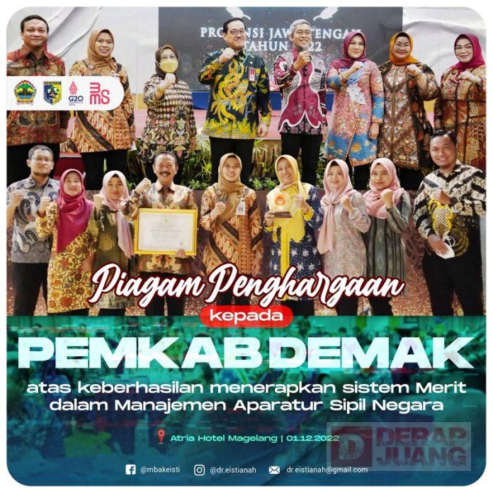 Kamis (01/12/2022), hal itu diungkapkannya setelah menerima Anugerah atas Keberhasilan Pemkab Demak Menerapkan Sistem Meritokrasi dalam Manajemen Aparatur Sipil Negara di lingkungan Pemkab Demak.