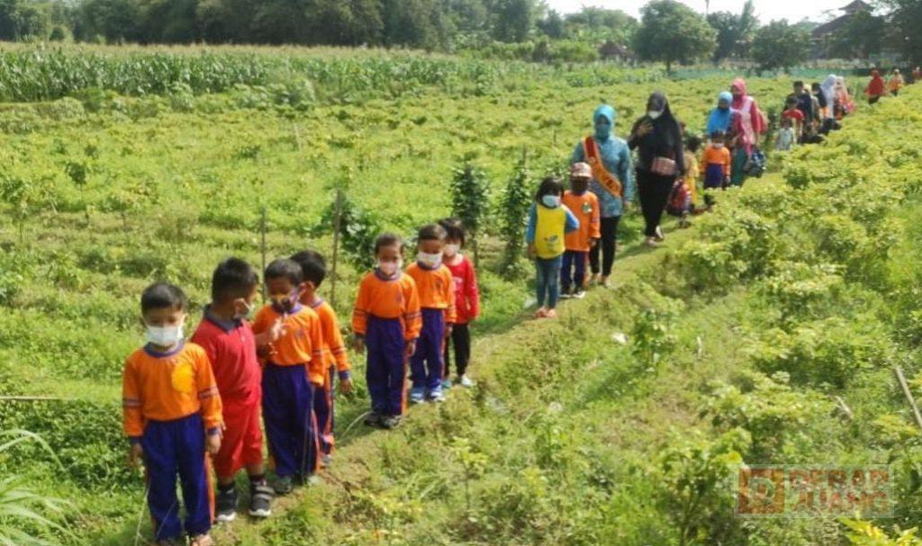 Kabupaten Klaten – Pembelajaran untuk anak usia dini hendaknya memiliki variasi, seperti dengan mengenalkan lingkungan sekitar. Para siswa di lembaga Pendidikan Anak Usia Dini (PAUD) Kelompok Bermain (KB) Harapan dan Taman Kanak-Kanak (TK) Pertiwi di Desa Joho, Kecamatan Prambanan, diajarkan untuk mengenal lingkungan sekitar, serta masyarakat sejak usia dini. Hal tersebut sampaikan pengelola PAUD Desa Joho, Dewi Anggreani, A.Md, Senin (25/10/2021).